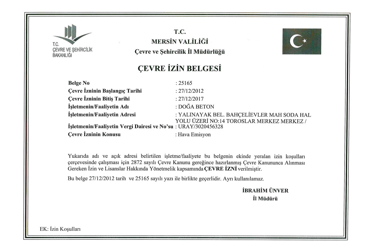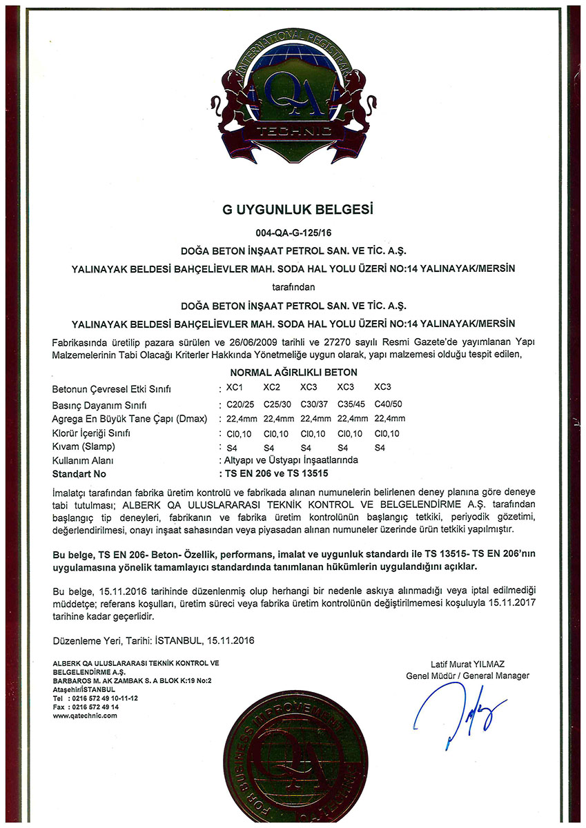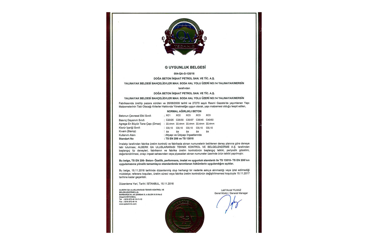 Doğa Beton A.Ş. olarak yönetmeliklere ve kalite standartlarına uygun olarak üretim yapmak felsefesiyle G Belgesi almak üzere ;