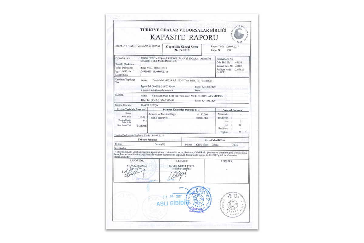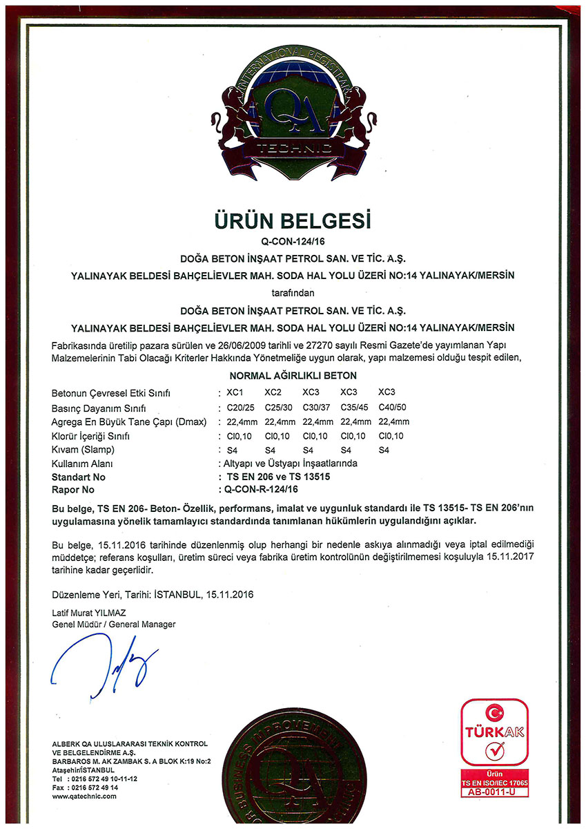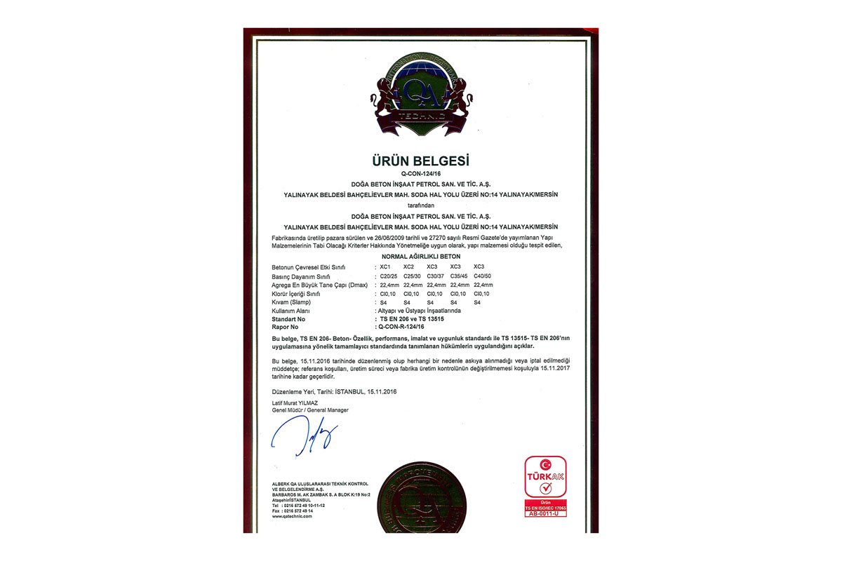 * Son aşamada ise üretimden her beton sınıfı için alınan numunelerin mukavemet kontrolleri onaylanmış bir kuruluş tarafından denetlenerek, G Belgesini Kalite Belgeleri arasına katmıştır.